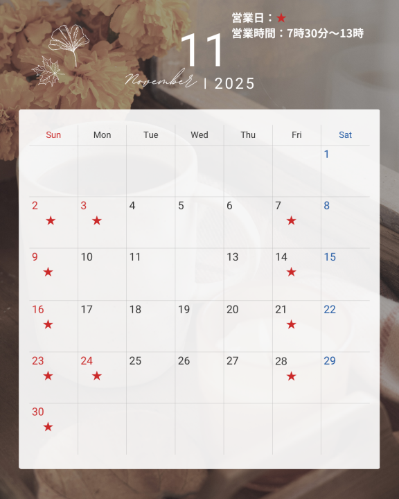 - 5月のお休み 5/11(木) 5/13(土) 5/18(木) 5/25(木) 5/29(土)