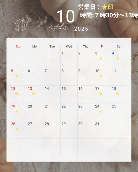 - 10月の休診日 毎週土曜日、10/19(木)10/24(火)